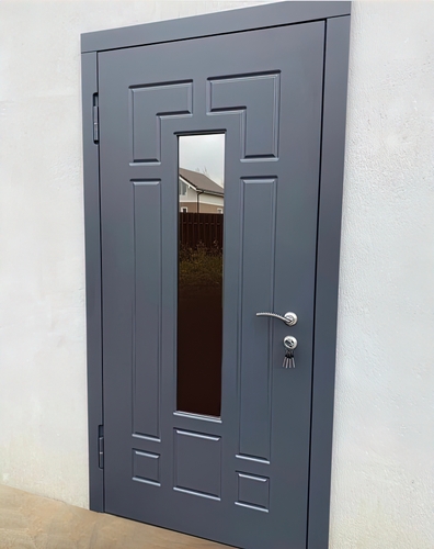 Серая дверь окрашенная по RAL со стеклопакетом и решеткой