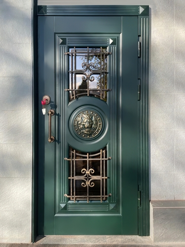 Дверь с отделкой МДФ, 3х-камерным стеклопакетом и кованой решеткой