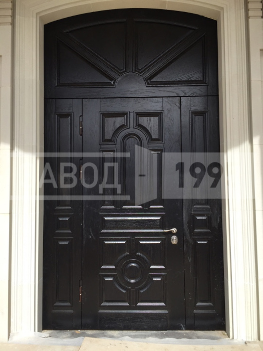 Дверь, которую заказал клиент для установки в дом, изготовлена из массива дуба с тремя вставками, багетом и доборами, также на двери выполнен фрезерованный рисунок. Фурнитура для двери выбрана золотого оттенка.