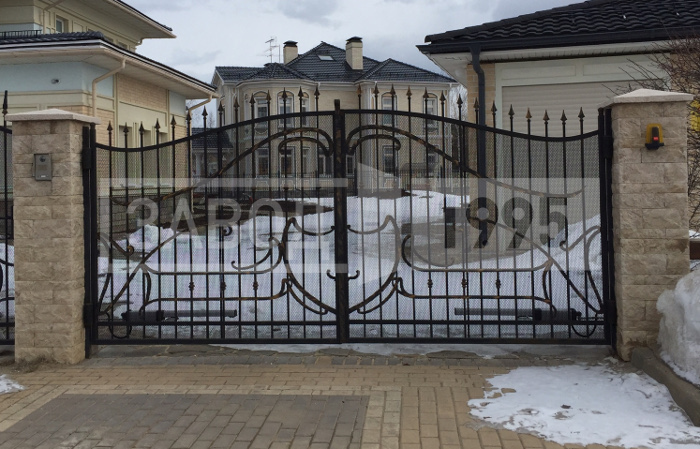 Солидный массивный забор, калитка и ворота изготовлены из крепкой стали кованым методом. Центр ворот и калитки украшен кованым рисунком из квадратного прутка диаметром 12х12 мм. Верхушки прутков на заборе и калитке отдекорированы коваными пиками с патиной.